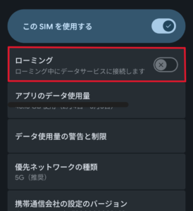 3.「データローミング」のスイッチをONにする