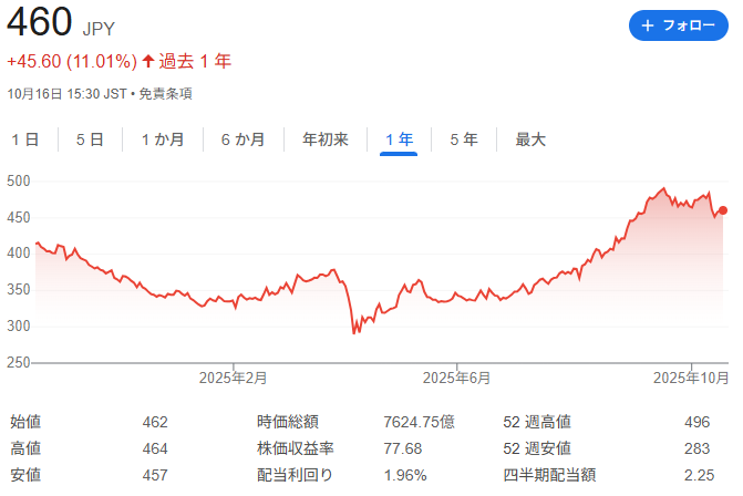 一方で、2025年春からは株価は上昇傾向に転じ、9月まで上昇基調が続いていました。