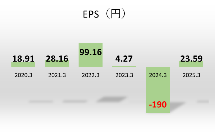 しかし、2025.3にプラスに転換し、今期(2026.3)予想は24.66とさらに伸びる見込みです。