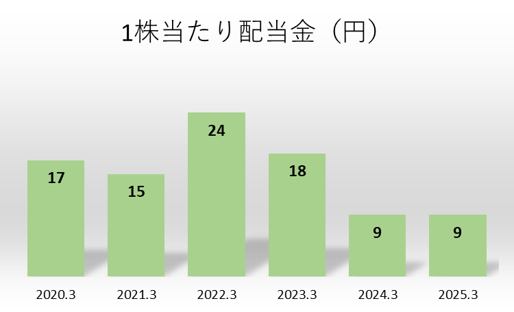 特に、直近だと赤字転落時にさらに減配となりました。現在は1株当たり9円で推移しています。