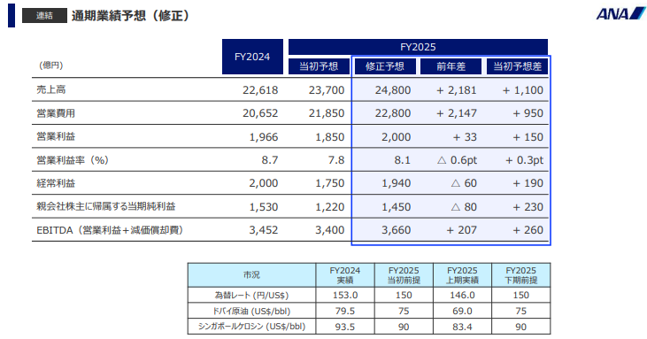 ANAはドル建てコストが多いため、円安の影響がストレートに出ます。