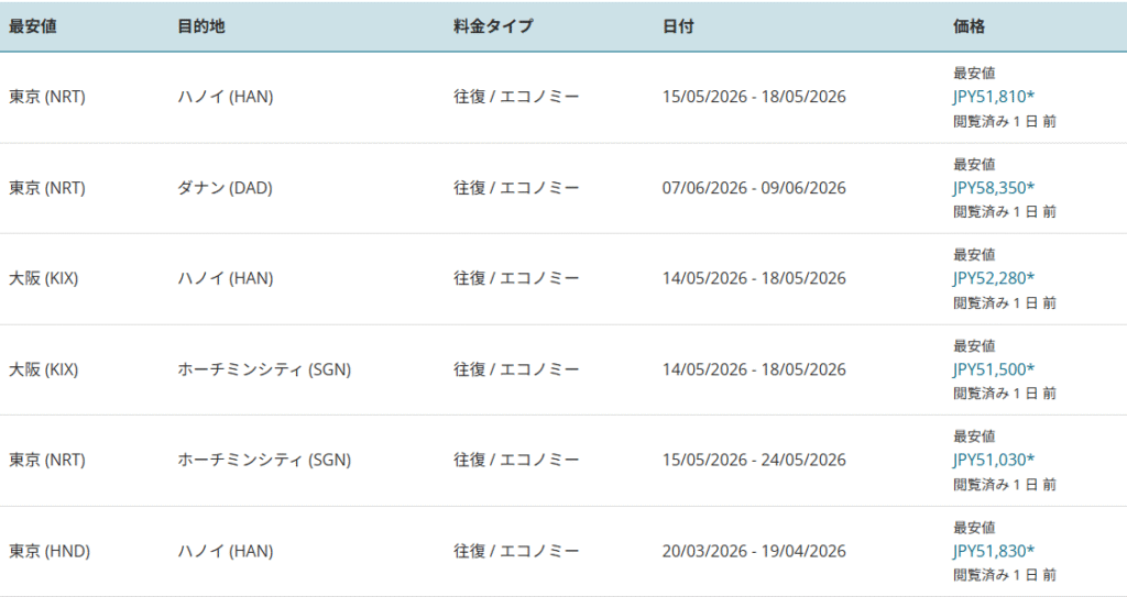 ベトナム航空の場合は、往復50,000円が相場だね。50,000円台前半の航空券があったら即購入がおすすめ!