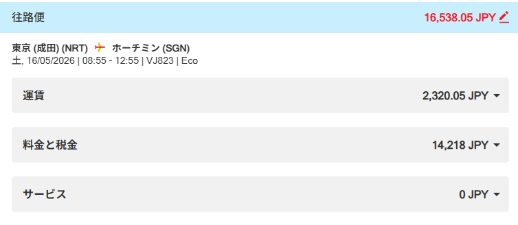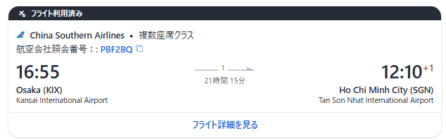 私は2024年の年末にベトナムホーチミンに行った際には、中国南方航空の上海経由の航空券を片道約20,000円で購入したよ!
